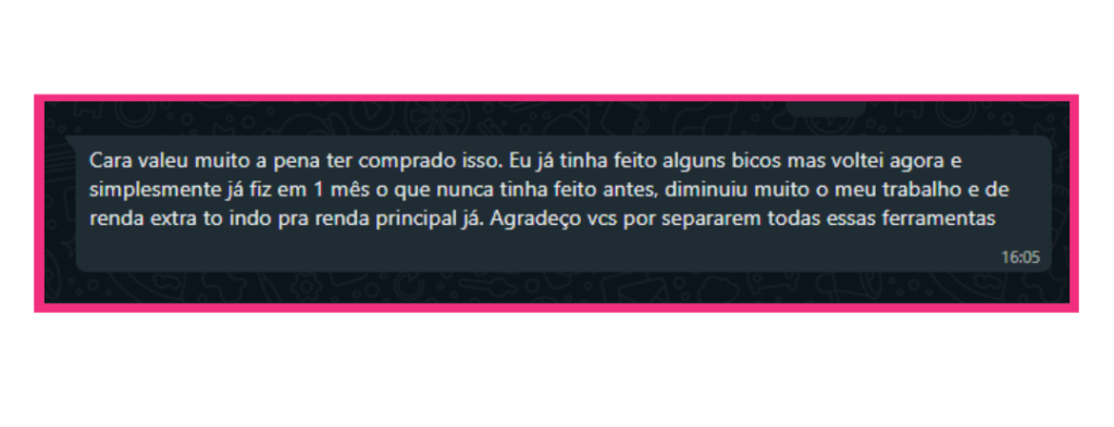 Várias pessoas já estão usando e aproveitando o DigiTools e todos os bônus. Esse depoimento é do Bruno (ele permitiu que fosse utilizado) e assim como ele, várias pessoas estão fazendo muito dinheiro apenas utilizando algumas dessas ferramentas e vendendo serviços.